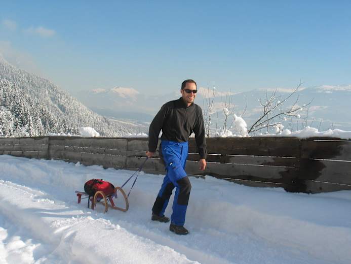 Ambitionierte Rodler nehmen es gemütlich, setzen sich auf die Rodel und zischen die letzten zweihundert Meter gemütlichen zur Hütte.