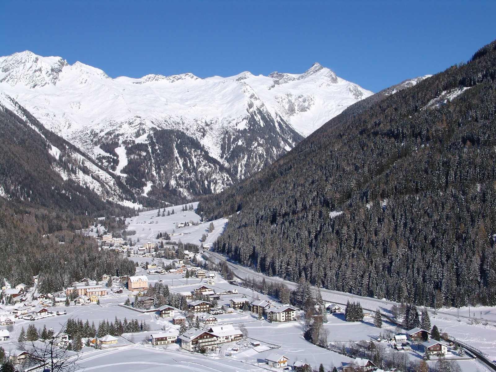Blick über Mallnitz ins Seebachtal. Auf den freien Wiesen in Bildmitte ist der Winterwanderweg zu erkennen. Foto: NPR, B. Grässl, Hohe Tauern - die Nationalpark-Region in Kärnten Tourismus GmbH Bildergalerie (12)