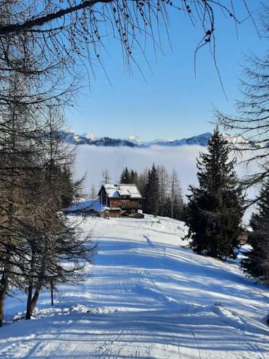 Einfache und gemütliche Winterwanderung zur urigen Kleinarler-Hütte in den Radstätter Tauern in Salzburg. Vom Hirschleitenparkplatz führt der bestens präparierte Weg direkt zur Hütte. Hausgemachte Spezialitäten laden zur Stärkung.
