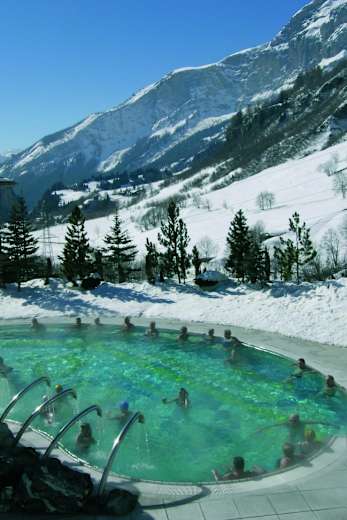 Zurück ins Tal geht es im Winter zwangsläufig mit der Seilbahn. Sie bringt die Gäste von der Bergstation (2.343 m) rasch in die grösste Thermalkur- und Wellness-Station der Alpen. Mehrere Thermalquellen spenden in der Leukerbader Therme jeden Tag gut 4 Mio. Liter Wasser mit einer Temperatur von 51 ºC. Das Wasser ist reich an Kalzium, Schwefel und Eisen - das Ergebnis einer mindestens 40-jährigen Reise durch das alpine Gestein. Kurgäste und Rehabilitationspatienten sowie müde Passwanderer wissen seine positive Wirkung zu schätzen.