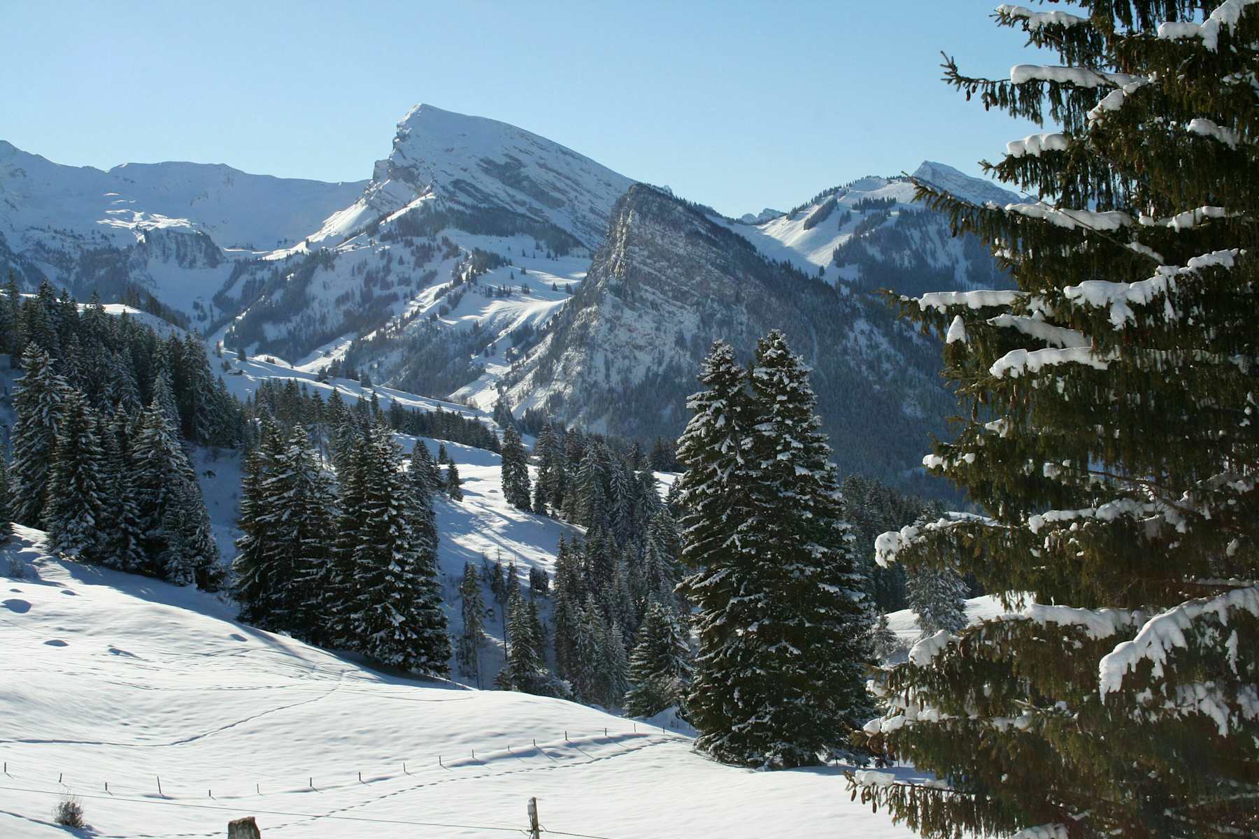 Gleich zwei Varianten bietet diese aussichtsreiche Winterwanderung in den Berner Alpen. Die 15 Kilometer langen Winterwanderwege im Ski- und Wandergebiet Springenboden führen den Wanderer durch die tief verschneiten Wälder und Weiden des Diemtigtaler Südhangs, hoch über dem Talboden des Regionalen Naturparks Diemtigtal im Berner Oberland.