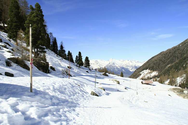Die Winterwanderung beginnt beim rosa Schild bei der Bushaltestelle von Siviez. Von hier geht es auf dem Waldweg des Eaux Richtung Lavantier.