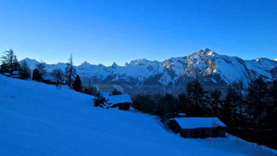 Schöner Winterspaziergang inmitten der Walliser Alpen am Ortsrand von Haute Nendaz. Der Rundweg bietet eine schöne Aussicht auf das Rhonetal und ist auch für Familien mit Kindern und geländegängige Kinderwagen geeignet.
