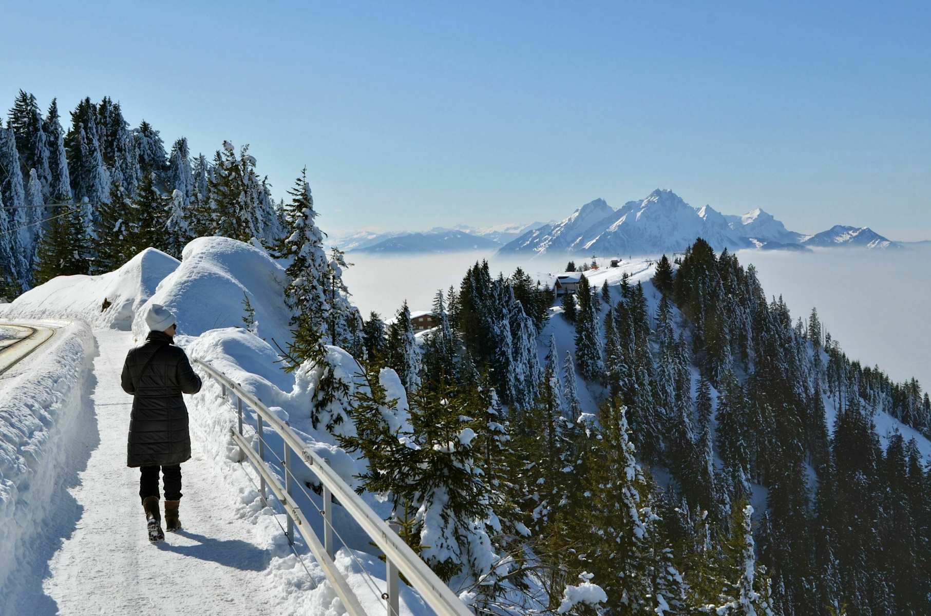 Hochgenuss mit minimaler Anstrengung: einfache Winterwanderung zwischen Luzern und Schwyz von Rigi Kulm nach Rigi Kaltbad, die zum gemütlichen Schlendern einlädt und auch für Familien mit Kindern gut machbar ist.