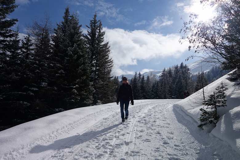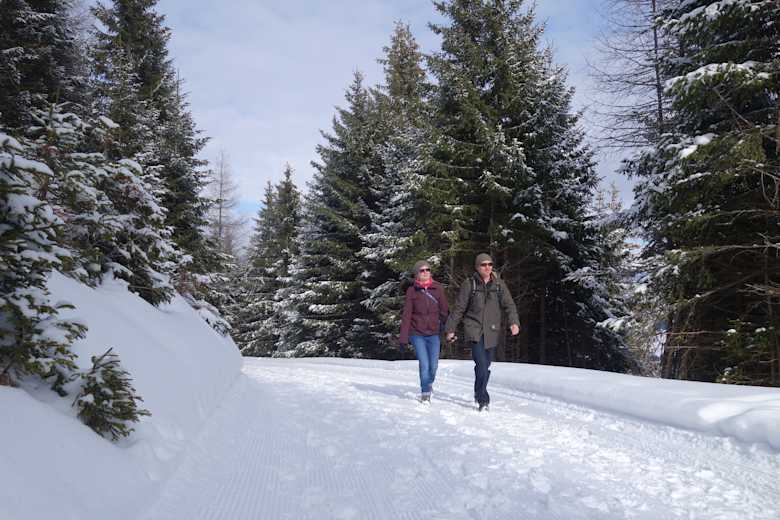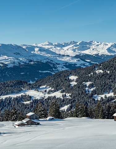Am Wegesrand geben tief verschneite Tannen immer wieder den Blick frei auf die winterliche Berglandschaft. Bis zum Parpaner Rothorn hoch über Lenzerheide reicht die Aussicht. Besonders schön ist die Gegend um Seznis, wo der Dreibündenstein (2.160 m) das grandiose Panorama dominiert.