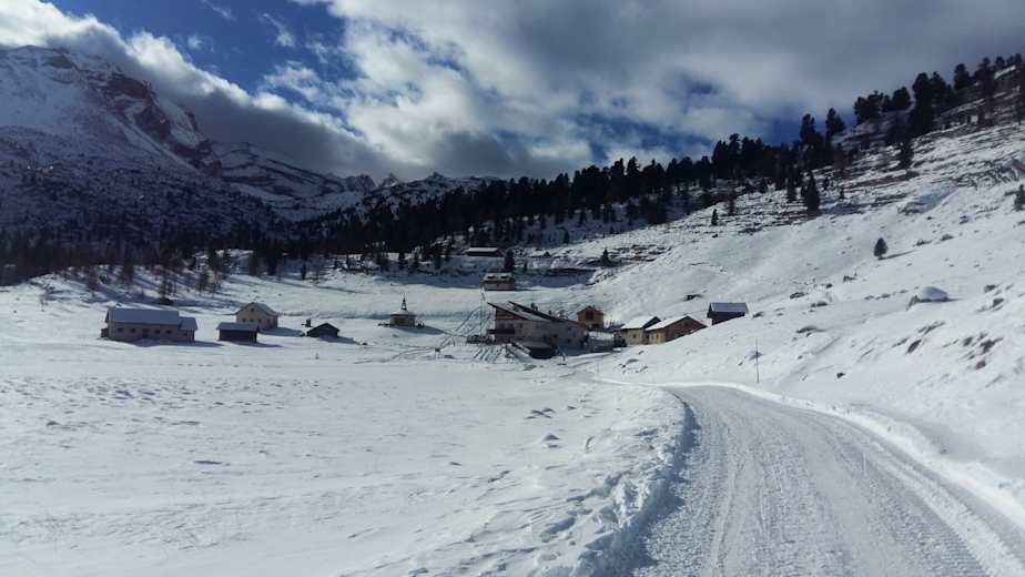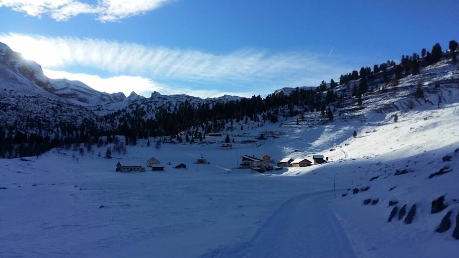 Vom Parkplatz des Berggasthauses Pederü (1.540 m) folgt man der ausgewalzten Pistenraupenspur in südliche Richtung in mäßig ansteigenden Serpentinen, dann flach durch das offene Becken des Vallun de Fanes. Nun folgt man der Aufstiegsspur durch den Wald und lässt die von den Motorschlitten befahrene Schneespur links liegen. Nach einem steileren Stück folgt man dem Weg wieder in südliche Richtung, bis man die ersten Almhütten erreicht. Anschließend wandert man gemütlich am zugeschneiten Piciodelsee vorbei und folgt dem Weg bis zu einer Gabelung mit großem Hinweisschild.