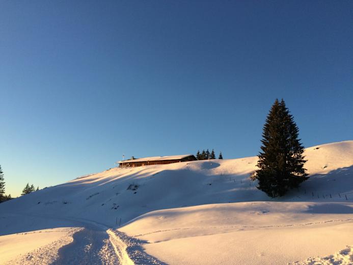 Leichte Winterwanderung zur Oberen Mittelalpe auf 1.420 m am Fuße des Riedberger Horns in den Allgäuer Alpen. Wer möchte, der kann auch die Rodel mit nehmen, wobei es bei der Abfahrt einen kleinen Gegenanstieg zu bewältigen gibt.