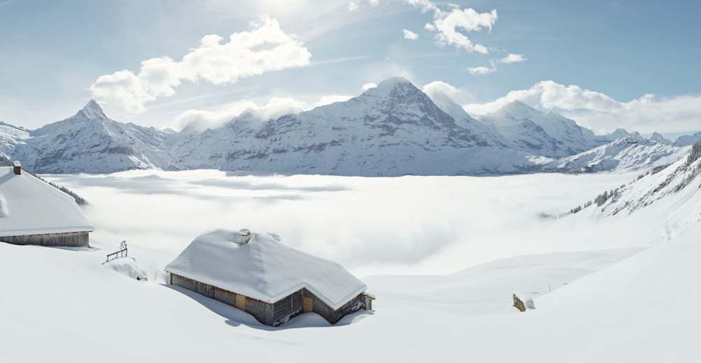 Von der Bussalp, direkt an der Mittelstation der Gondelbahn Grindelwald First, führt der aussichtsreiche Winterwanderweg über das Rasthysi nach Bort. Während das Tal von Grindelwald oft noch im Schatten liegt, wärmen hier oben bereits die ersten Sonnenstrahlen die Hänge.