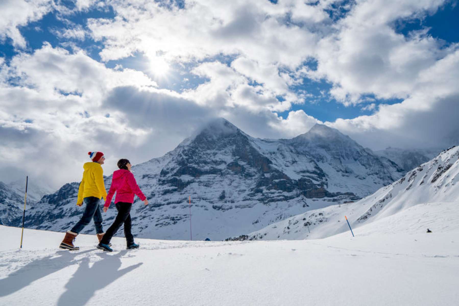 Die schöne Winterwanderung im Berner Oberland führt hoch über Grindelwald und Wengen vom Männlichen (2.229 m) zur Kleinen Scheidegg (2.061 m). Unterwegs hat man eine grandiose Aussicht auf das berühmte Dreigestirn von Eiger, Mönch und Jungfrau und das Grindelwaldtal.