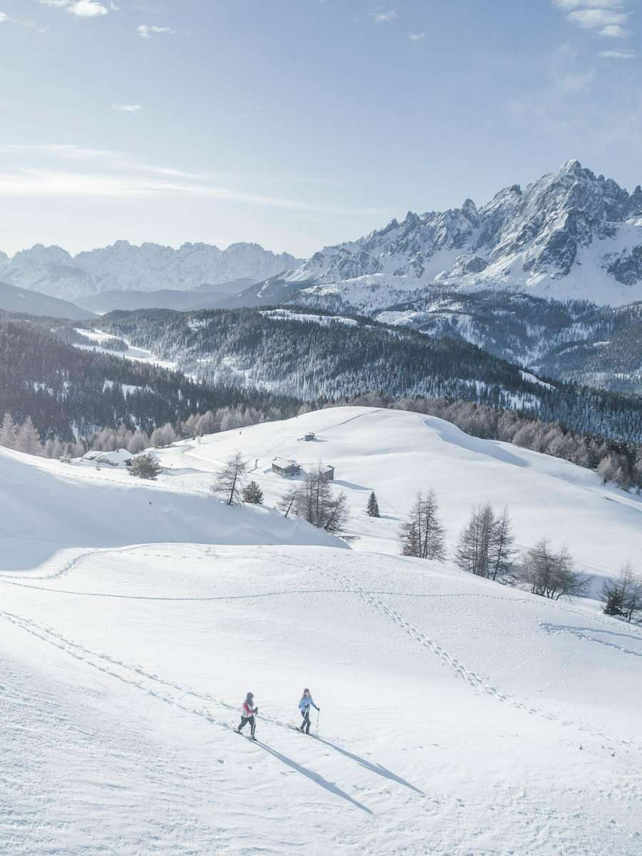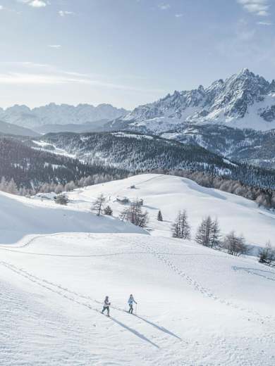 Eine schöne und angenehme Winterwanderung führt von der Riese-Haunold-Hütte oberhalb von Innichen in der Drei Zinnen Dolomitenregion abwärts nach Innichen. Dank Sesselbahn sparrt man sich mühevolle Höhenmeter aufwärts und kann das Panorama schon bei der Fahrt mit der Bahn genießen.