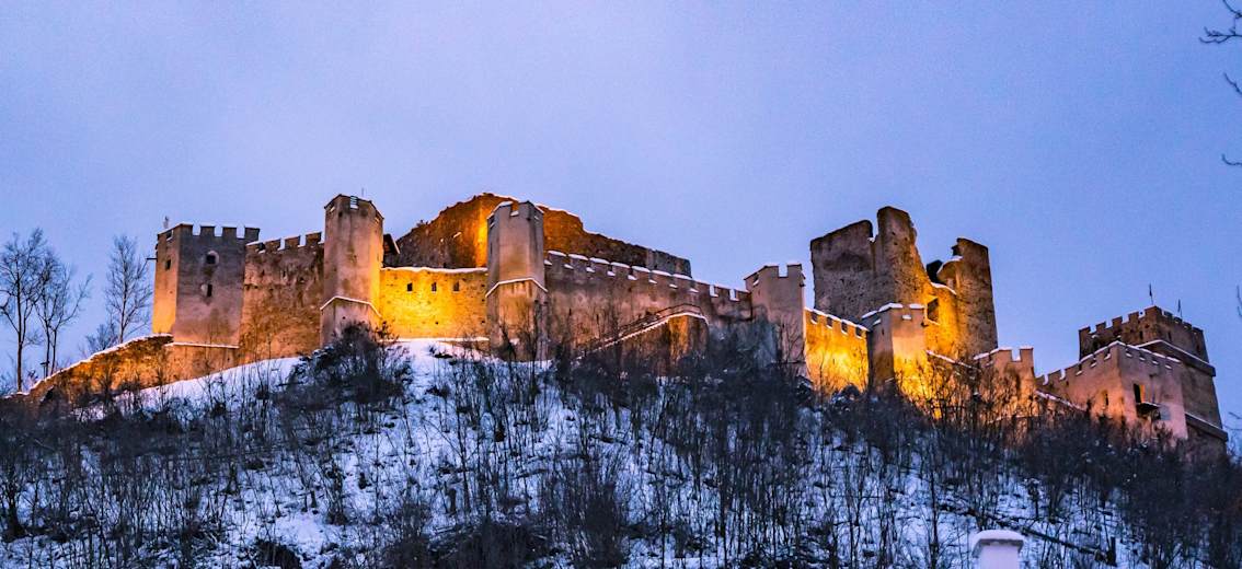 Der Passionsspielort Kirchschlag in Niederösterreich ist das ganze Jahr über ein Besuchermagnet. Im Winter bietet sich eine schöne Runde vorbei am Passionsspielhaus und durch den Rosengarten an. Besonders schön ist die abendlich beleuchtete Burgruine Kirchschlag.