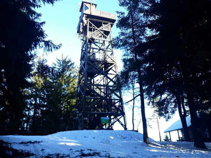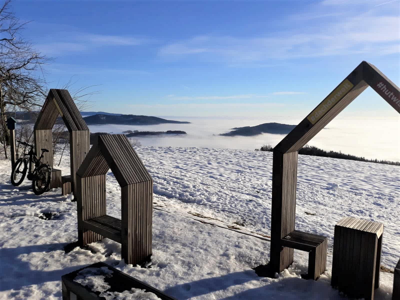 Aussichtsreiche winterliche Rundwanderung am Bakabu-Erlebnisweg in der Buckligen Welt in Niederösterreich. Entlang von Hörerlebnisstationen wandert man hinauf auf die Hutwischwarte, wo man vom Aussichtsturm einen tolle Fernsicht genießt.