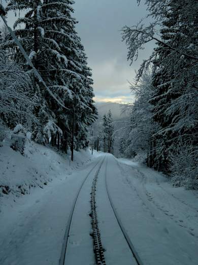 Eine schöne Winterwanderung entlang der Schneebergbahn bis zur Hengsthütte auf 1.012 m in der Rax-Schneeberggruppe in Niederösterreich.