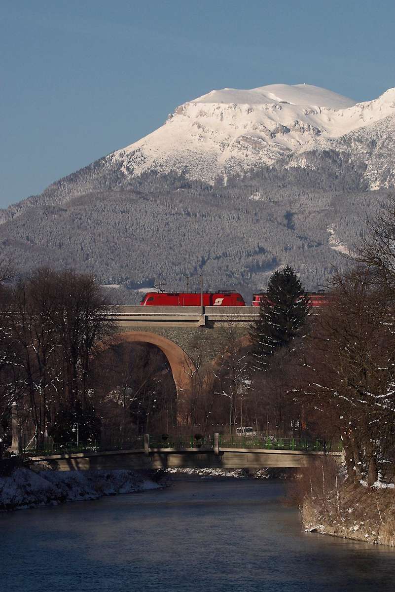 In der Mitte des Ghegasteges steht ein Bankerl zum Ausruhen bereit. Hier kann man in Ruhe den wunderbaren Blick auf das Raxmassiv und flussabwärts den Ausblick auf den Geyerstein und den Grillenberg mit seinem Schaubergwerk genießen.