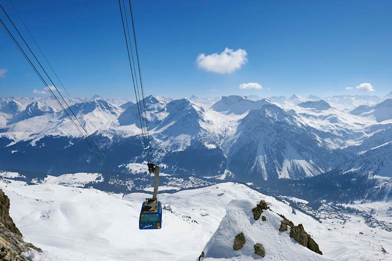 Mit der Rhätischen Bahn nach Arosa und über die Bahnüberführung hin zur Talstation der Luftseilbahn Arosa - Weisshorn. Mit beiden Sektionen bis ganz nach oben fahren.