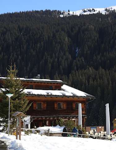 Vorbei am Hotel Prätschli und dem Prätschlistall führt der Weg wieder abwärts und gibt nun den Blick frei über die Langlaufloipen von Maran bis Medergen an der gegenüberliegenden Talseite. Wer hier noch etwas Energie hat, kann die Tour etwas verlängern und noch weiter in Richtung Arlenwald aufsteigen, um dann über das Maraner Hüschi nach Maran zu laufen.