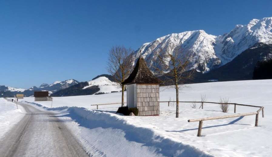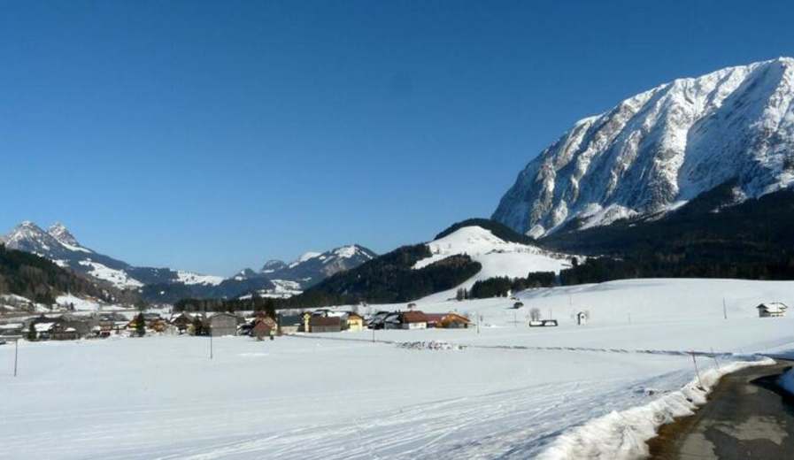 Eine traumhafte Winterwanderung bei Bad Mitterndorf im Ausseerland. Die Route führt durch Wälder und über Wiesen und bietet immer wieder schöne Aussichten auf die Berge und idyllischen Dörfer.