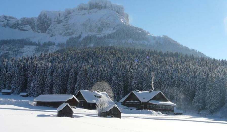 Das Gelände der Blaa Alm zwischen Loser und Sandling im Ausseerland ist ein traumhaftes Winterwandergebiet. Ruhig, sonnig und meist tief verschneit präsentiert sich die Landschaft.