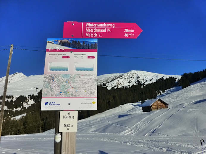 Von der Sesselbahn Metschmaad aus führt der gespurte Weg nun dem Waldsaum des Metschgrabe entlang hinunter zur Metsch. Dieser Wegabschnitt überwindet rund 180 Höhenmeter und ist daher an einigen Stellen etwas steil. Dafür entschädigt das wunderbare Panorama hinüber zu Wildstrubel, Plain Morte und Wildhorn. Beim Abstieg hat man auch eine gute Sicht auf die nahen Skipisten welche zur Mittelstation des Stand Express führen. Dort ist auch der Winterwanderweg zu Ende. Ab hier kann man mit der Gondelbahn ins Tal fahren und von dort über den Talweg zurück in die Lenk wandern.