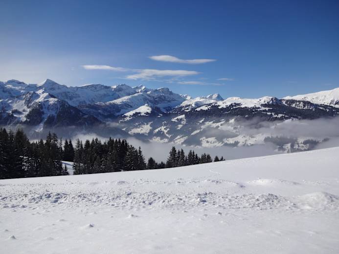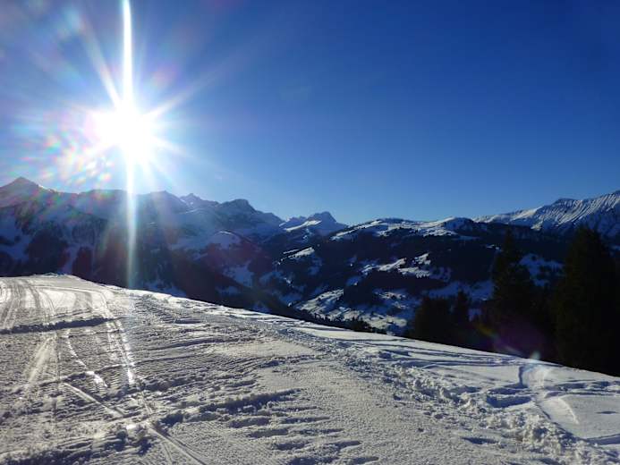 Der sonnige Bühlberg im Berner Oberland ist eine Art Aussichtswarte ins Simmental und hinüber in die Saaneländer Berglandschaft. Die einfache Winterwanderung zur Mittelstation Metsch des Stand Expresses ist daher ein schönes Erlebnis für die ganze Familie.