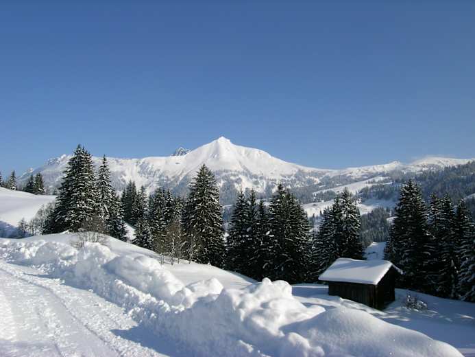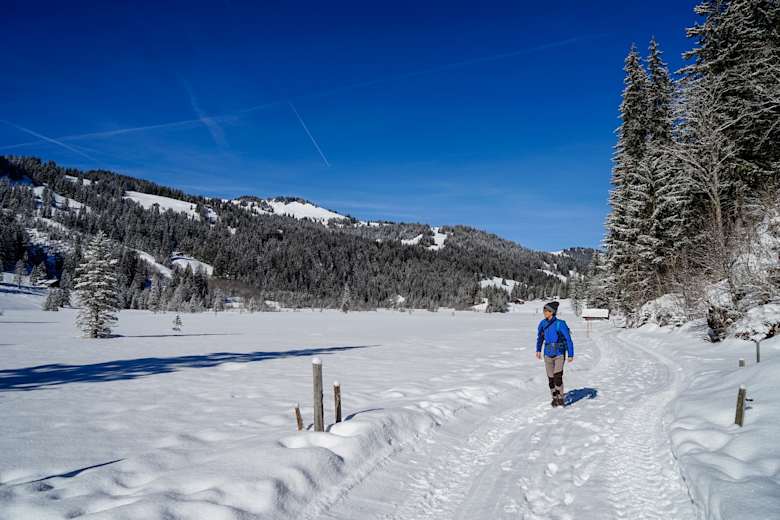 Von der Postauto-Endstation Lauenen/Geltenhorn führt ein Fussweg taleinwärts der Strasse entlang zum Hotel Alpenland. Hier starten die beiden Winter-Rundwege Lauenensee und Rohr. Zum Lauenensee hält man rechts und folgt dem Strässchen, das an Ferienchalets vorbei zum Waldrand führt. Dort schwenkt der Weg links um und führt in sanftem, aber stetigem Anstieg zum Weiler Hinderem See. In gleicher Richtung gehts auf dem breit gespurten Weg weiter über verschneite Weiden und durch kurze Waldabschnitte. Nach einer Linkskurve taucht unvermutet die weisse Ebene des zugefrorenen Lauenenesees auf. Da und dort ragen einzelne Tannen und Schilfrohrbestände am Ufer durch die dicke Schneeschicht, die den im Sommer und Herbst so farbenprächtig schimmernden See jetzt deckt. Ein ganz eigener Reiz geht von dieser weiten, ein klein wenig an arktische Ebenen erinnernden Landschaft aus.