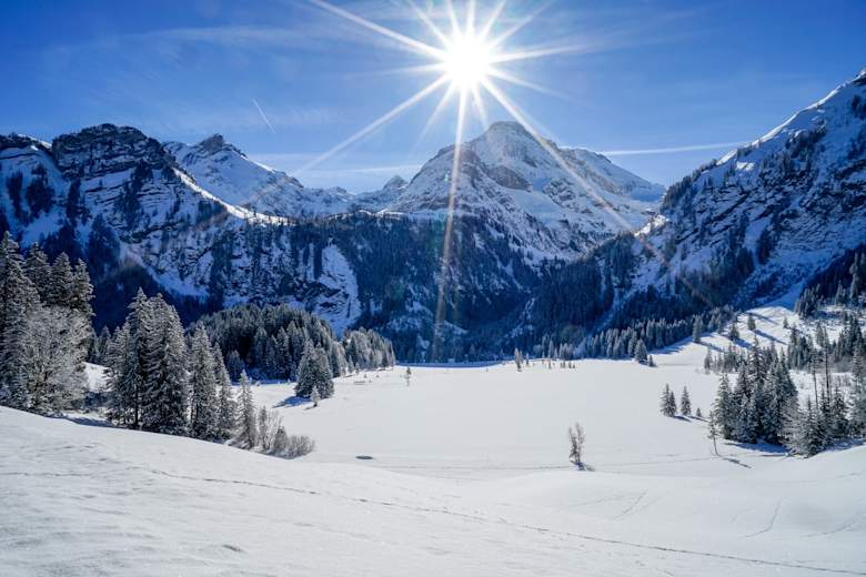 Das beschauliche und sehr ruhige Lauenental im Berner Oberland in der Schweiz lädt auch im Winter zu wunderschönen Winterwanderungen ein. Besonders lohnenswert ist die Tour zum zugefrorenen Lauenensee, der sich im Winter als weite schneebedeckte Ebene darstellt.