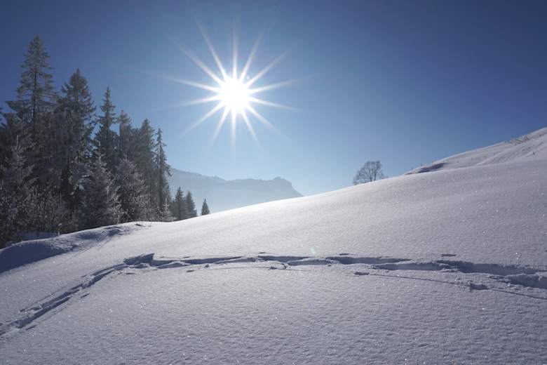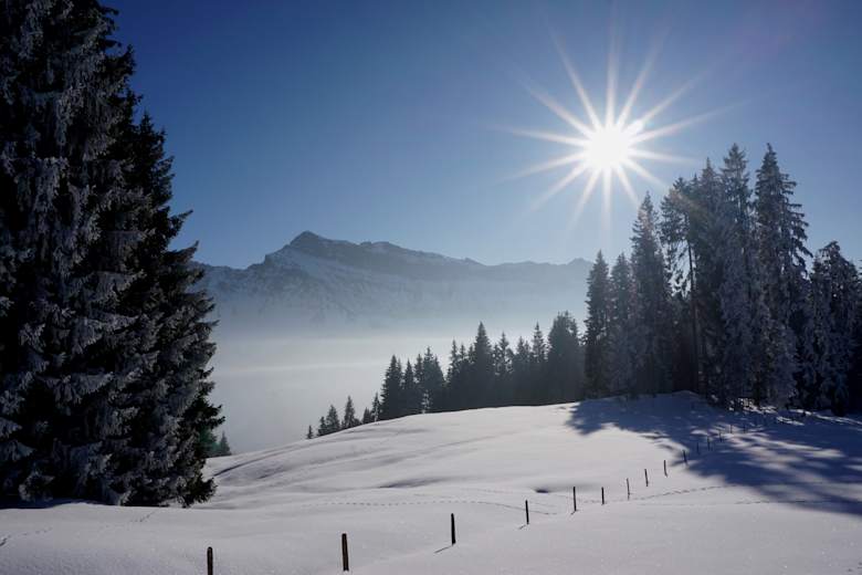 Sonne pur und praktisch nur abwärts wandern: So präsentiert sich die Winterwanderung von der Marbachegg hinunter nach Bumbach im UNESCO Biosphäre Entlebuch in der Schweiz. Auf dem Weg passiert man sogar die Kantonsgrenze zwischen Bern und Luzern.