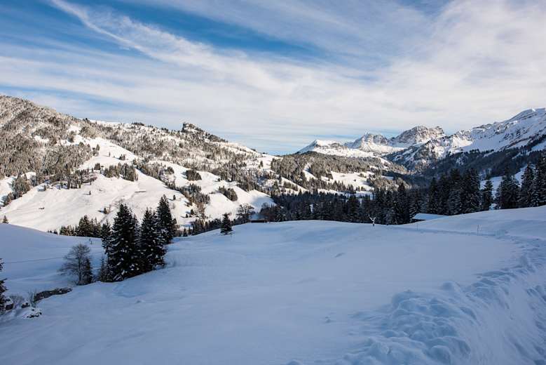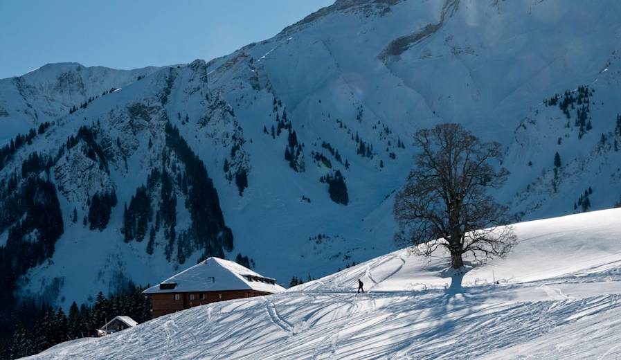 Bis ins Jahr 2005 wurden im Alpgebäude Schwand Kühe gehalten und Käse hergestellt. Nun verzaubert der Ausblick auf das Brienzer Rothorn, die Hagleren und die Schrattenfluh die Wintersportler.