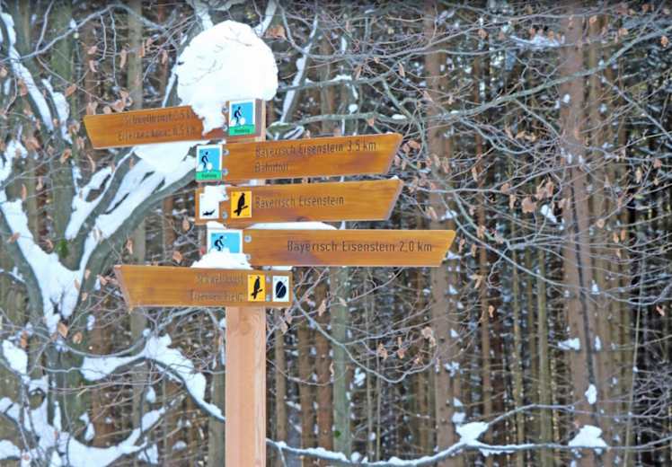 Man startet die Winterwanderung in Bayerisch Eisenstein. Der Ausgangspunkt ist ideal mit der Waldbahn erreichbar, wer mit dem PKW anreist kann am Wanderpark parken. Von dort aus folgt man dem 'Bussard' zunächst ein Stück durch den Ort und durch eine Waldbahn-Unterführung hindurch.
