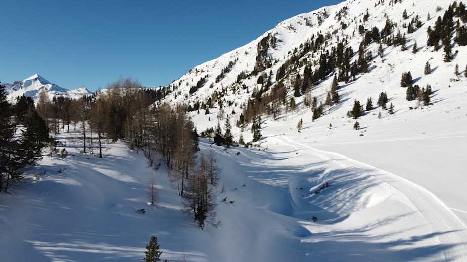 Es gibt mehrere Einstiegspunkte in den Winterwanderweg Schubertmulde. In diesem Fall starten wir bei der Almrauschütte und folgen dem Winterwanderweg in Richtung Osten zur Fluhbachalm. Weiter geht es über das weitläufige Gelände der Kehralm zur Gottschallalm und von dort entlang der Gottschallalmstraße wieder nach Obertauern.