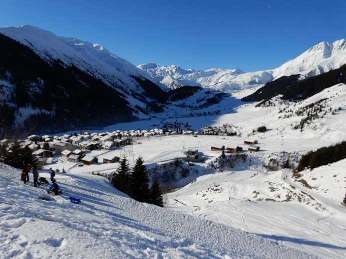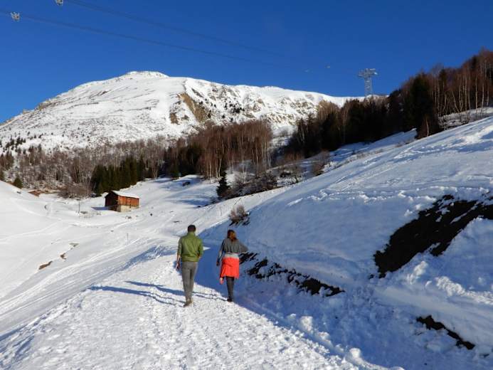 Wir entfliehen der Geschäftigkeit im Dorf und verlassen die bewohnten Häuser in Richtung Cungieri. Entlang eines sonnigen Hangs, da wo früher zuerst Ski gefahren, später geschlittelt wurde, führt nun ein gut präparierter Wanderweg auf die Anhöhe Cungieri.