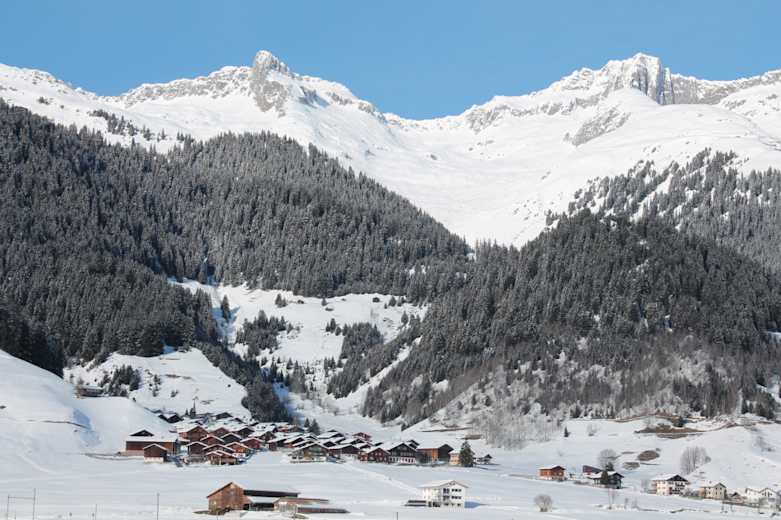 Etwas weiter Richtung Acletta und oberhalb der Skiwiese Sax kann es sein, dass Skifahrer unseren Weg kreuzen. Aber wir sind schnell wieder auf der sicheren Seite, wenn es durch Acletta zum Muntatsch weitergeht.