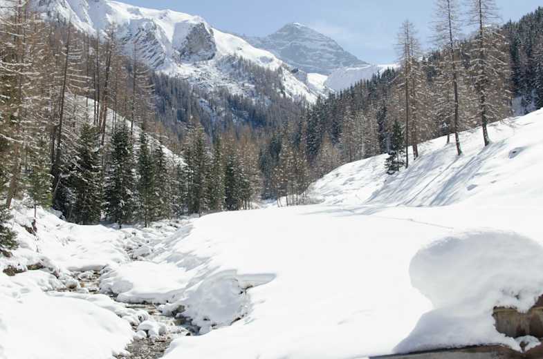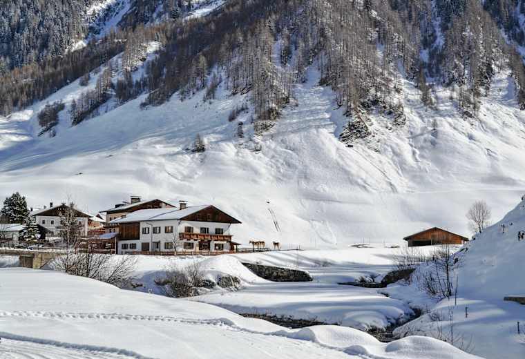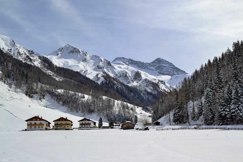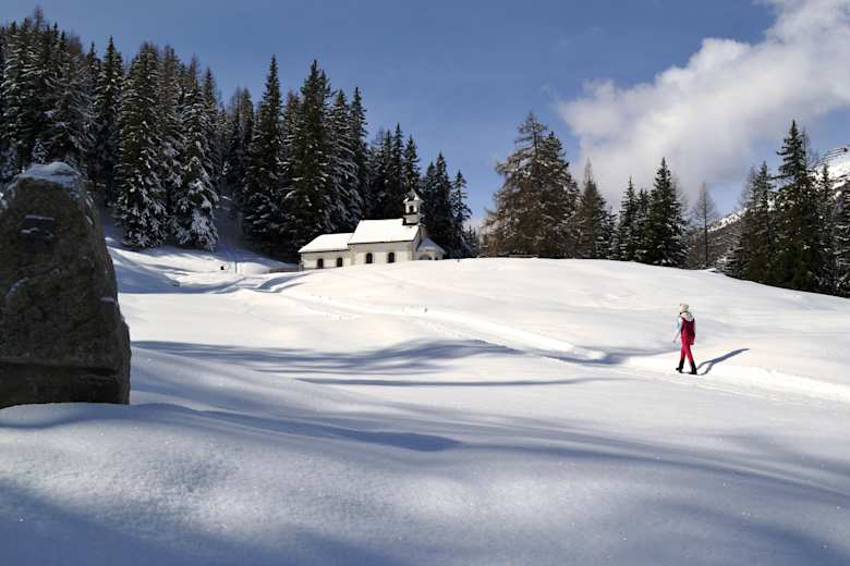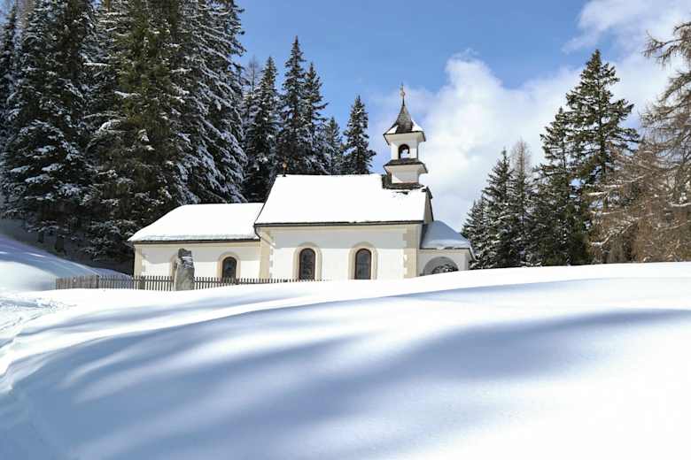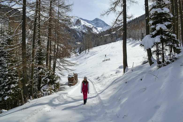 Schöner, idyllischer Winterwanderweg mit nur wenig Steigungen zur Bergwallfahrtskirche Kalte Herberge im Schmirntal im Bergsteigerdorf St. Jodok, Schmirn- und Valsertal in Tirol. Ausgangspunkt ist der Parkplatz Muchnersiedlung im Schmirntal.