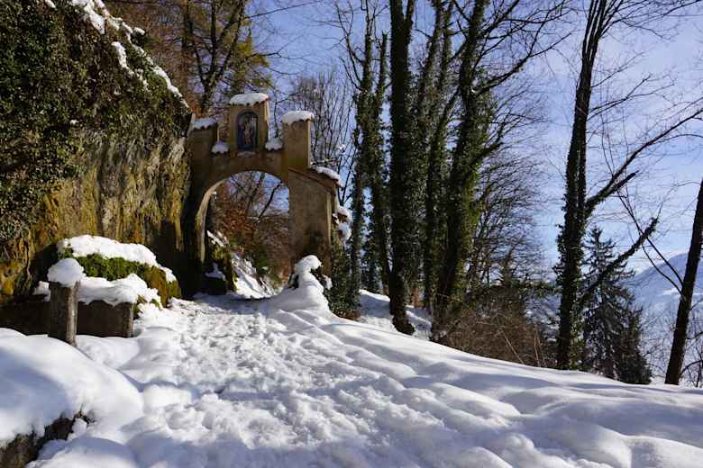 Auf dem steilen Kreuzweg mit seinen Grotten durch den romantischen Torbogen zum Romedius-Kirchlein (793 m). Schöne Aussicht auf Inntal, Mittelgebirge, Tuxer- und Stubaier Alpen.