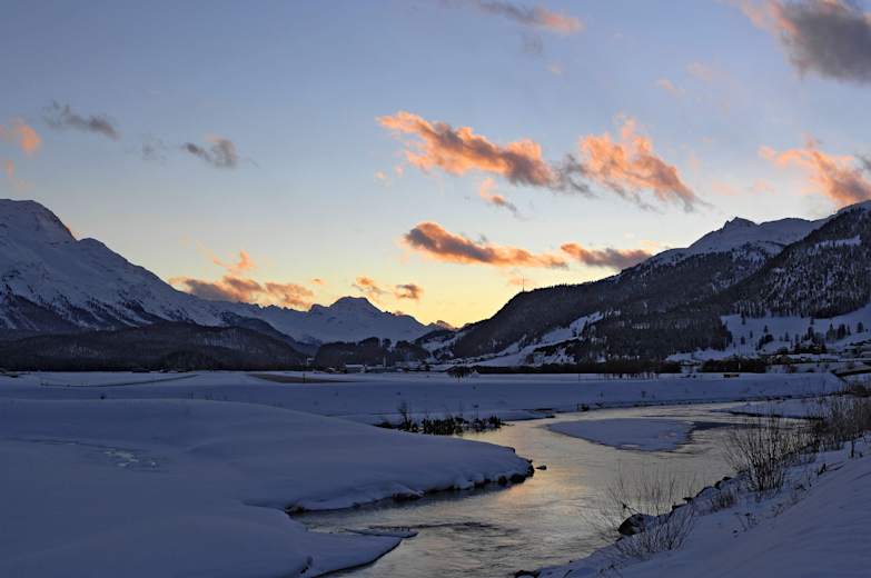 Die flache Winterwanderung führt durch das weite Tal und die Oberengadiner Flusslandschaft. Man genießt dabei die Tour dieser wunderschönen Landschaft im Engadin in Graubünden. Die Anreise ist ideal mit öffentlichen Verkehrsmitteln.