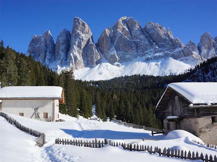 Die Wanderung über den gespurten Winterwanderweg beginnt im idyllischen Ranui im Villnösstal in Südtirol und führt durch den verschneiten Wald durch den Naturpark Puez-Geisler bis nach Zans, zur Glatschalm und über die Dusleralm und über Plantschee zurück nach Ranui.