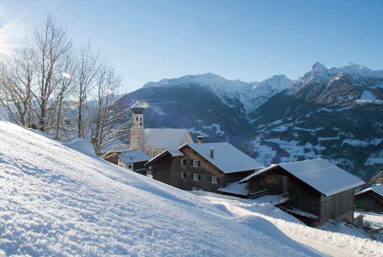 Diese mittelschwere Winterwanderung im Montafon führt von Bartholomäberg, dem Sonnenbalkon des Montafons zum Fritzensee.