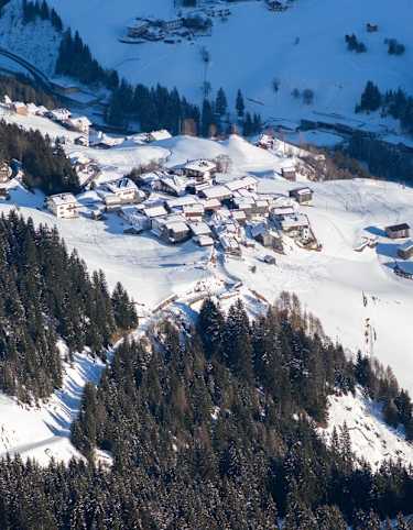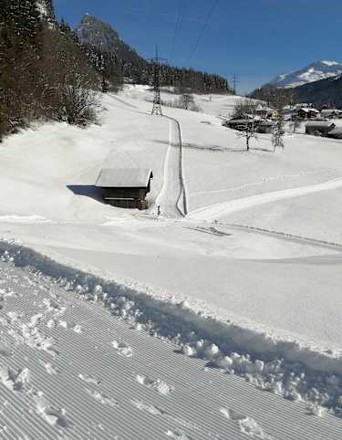 Im Gebiet Säga zweigst Du rechts ab und folgst der pinken Wegbeschilderung talwärts. Der präparierte Winterwanderweg führt durch leichte Waldabschnitte und an Maisäßen vorbei und du erreichst dann nach einiger Zeit die Ausstiegsstelle Stelzer. B