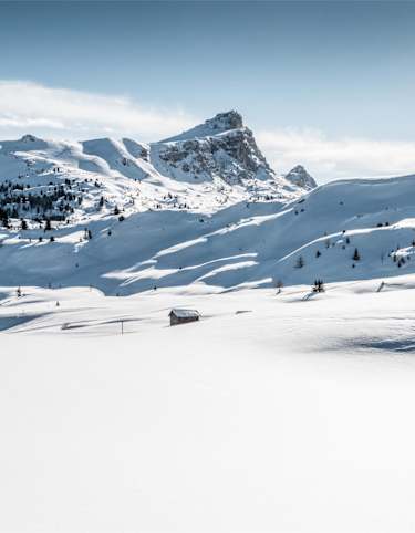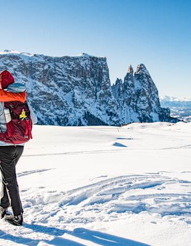 Ein angenehmer Spaziergang zum Entspannen und Genießen. Der Wanderer hat einen atemberaubenden Blick auf den Schlern, der von der Spitzbühlhütte aus zum Greifen nah scheint. Die Wanderung führt dann über weite, schneebedeckte Almen zum Ausgangspunkt zurück.