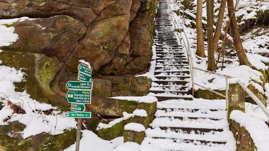 Diese mittelschwere Winterwanderung führt von Pirna in der Sächsischen Schweiz durch den Liebethaler Grund. Die Anreise kann gut mit öffentlichen Verkehrsmitteln geschehen.