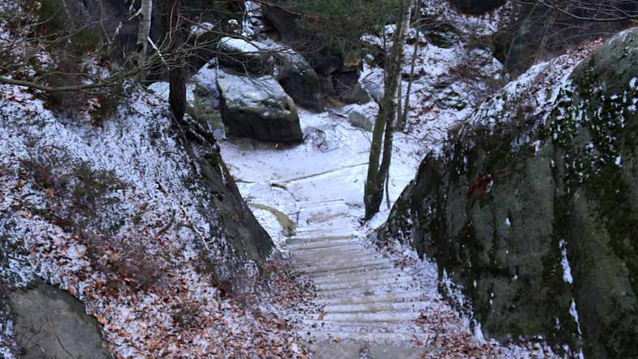 Diese anspruchsvolle Winterwanderung führt von Porschdorf in der Sächsischen Schweiz durch das Polenztal. Die Wanderung kann gut mit öffentlichen Verkehrsmitteln erreicht werden.