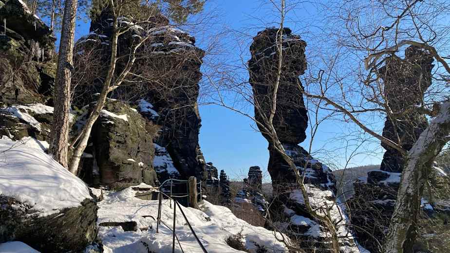 Diese mittelschwere Winterwanderung führt von Rosenthal in der Sächsischen Schweiz führt zu landschaftliche eindrucksvollen Felsgebilden. Die Tour kann gut mit öffentlichen Verkehrsmitteln unternommen werden.
