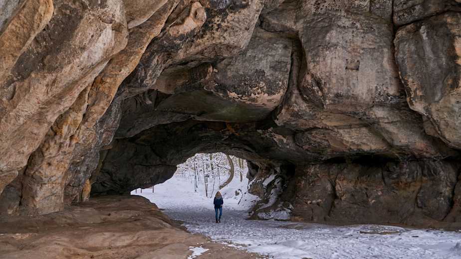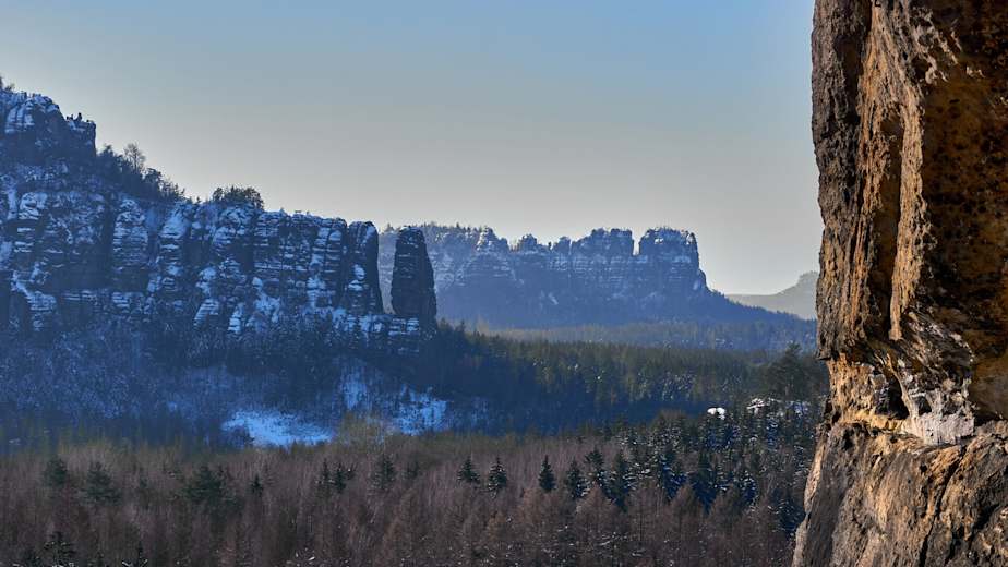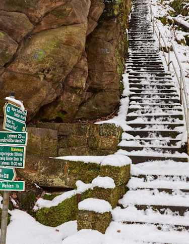 Diese anspruchsvolle Winterwanderung beginnt am Lichtenhainer Wasserfall in der Sächsischen Schweiz. Sie ist eine Rundtour und bietet schöne Einkehrmöglichkeiten. Man kann die Tour gut mit öffentlichen Verkehrsmitteln erreichen.