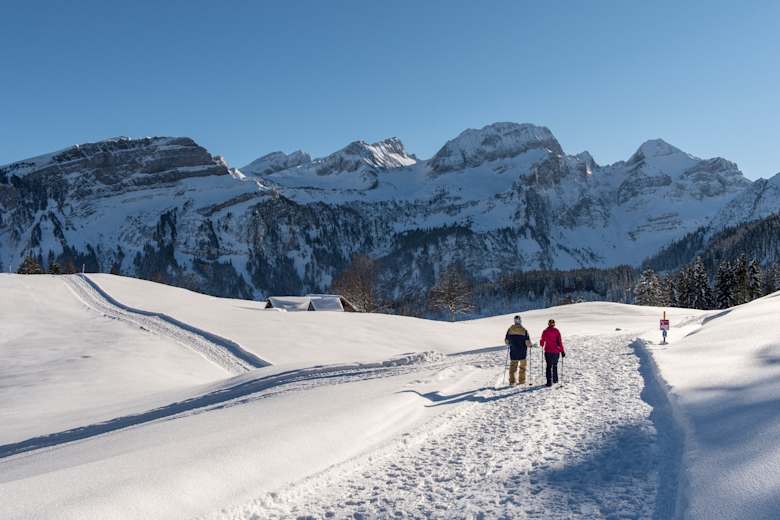 Lassen Sie sich von Wildhaus bequem mit der Sesselbahn ins Oberdorf fahren. Folgen Sie danach den Wegausschilderungen. Zu Beginn der Wanderung führt der Weg linkerhand vom Tellerskilift den Hang hinauf. Bald zweigt der Weg in den Wald ab und mit jedem Schritt wird es ruhiger. Sie finden sich in einer anderen Welt wieder. Die Alpweiden sind im Winter unberührt, nur die Spuren der Gämsen, Rehe, Hasen und Füchse zieren den Schnee. Vorbei an lichten Wäldern und eingeschneiten Alphütten wandern Sie durch eine sanfte, hügelige Winterlandschaft.