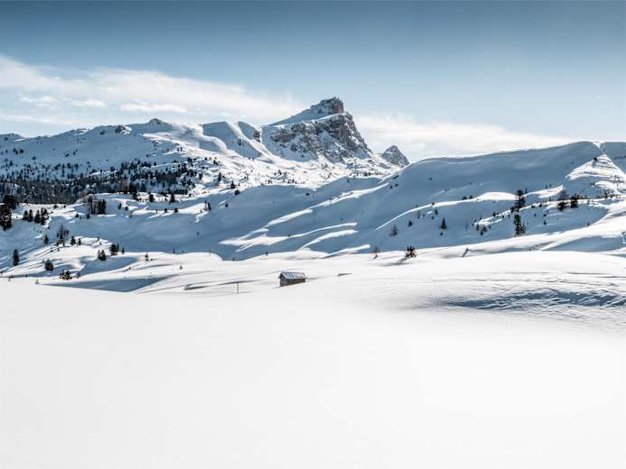 Vom Pralongiá Plateau aus bietet sich eine einzigartige Aussicht: Erleben Sie ein 360° Panorama, das einige der schönsten Dolomiten-Gipfel umfasst, angefangen beim Marmolada Gletscher bis hin zur Grup dl Sela. Genießen Sie den Blick von der Fanes-Gruppe bis zu den Gipfeln am südlichen Rand des Puez-Geisler Naturparks, darunter Sassongher und Peitlerkofel. Südtirol lädt Sie ein, diese faszinierende Winterkulisse zu erkunden.