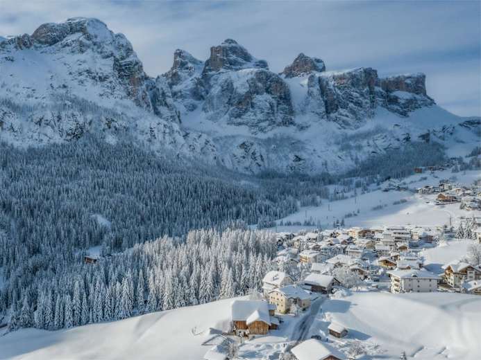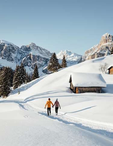 Der unschwierige Spaziergang durch verschneite Wiesen und Wälder führt bis zu den beeindruckenden Pisciadú-Wasserfällen. Erleben Sie eine entspannte Wanderung durch die winterliche Landschaft in Südtirol am Fuße der Bergwelt der Dolomiten, wie dem Sella-Massiv, den Cir-Spitzen und dem Sassongher.
