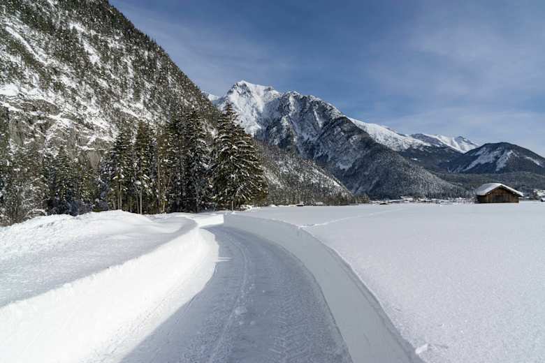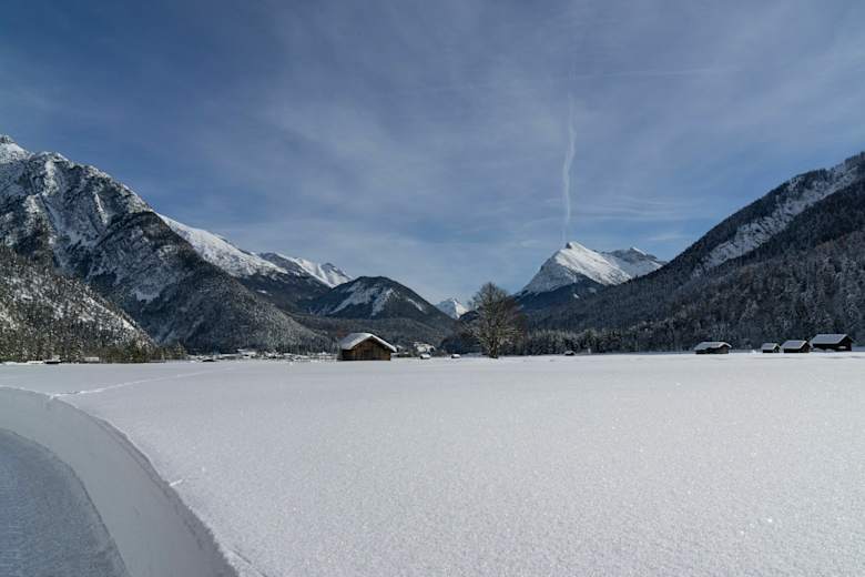 Diese gemütliche kleine Winterwanderrunde startet direkt beim Naturpark-Infozentrum Scharnitz und führt von dort ein kurzes Stück auf der Hinterautalstraße nordwärts bis zur Pfarrkirche Maria Hilf an der Innsbrucker Straße. Die Hauptstraße hier nun einmal kreuzen und auf der anderen Seite dem Hirlanda-Ellmann-Weg weiter durchs Dorf und bis zur nächsten Weggabelung folgen. Dort einmal rechts, einmal links einen kleinen Haken schlagen und dann auf dem Wanderweg am Fluss in einer wunderschön verschneiten Landschaftsschleife bis nach Gießenbach weiterwandern.