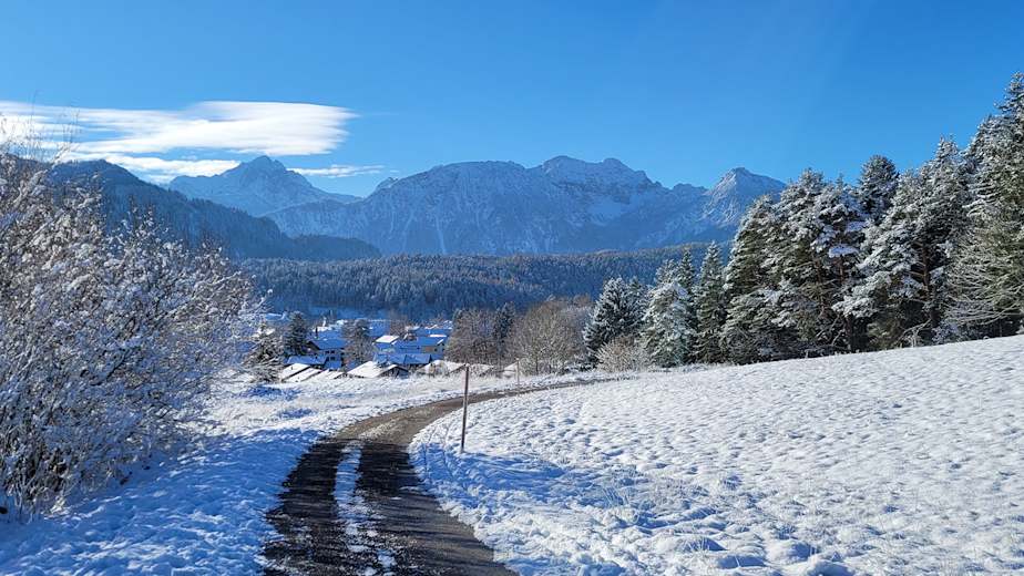 Der perfekte Mix aus Natur und Kultur: Diese kurze, familienfreundliche Winterwanderung durch Füssen bietet neben schönen Ausblicken auf die historische Altstadt und das Hohe Schloss auch traumhafte Bergblicke auf Ammergauer und Allgäuer Alpen.