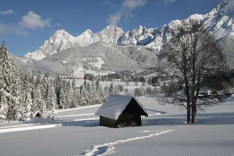 Aussichtsreiche Winterwanderung auf einem sonnenverwöhnten Hochplateau: Vom Langlaufzentrum in Ramsau am Dachstein führt die abwechslungsreiche Runde in der Steiermark einmal um den Kulmberg. Unterwegs warten zahlreiche Einkehrmöglichkeiten und eine herrliche Aussicht auf das Dachsteinmassiv.