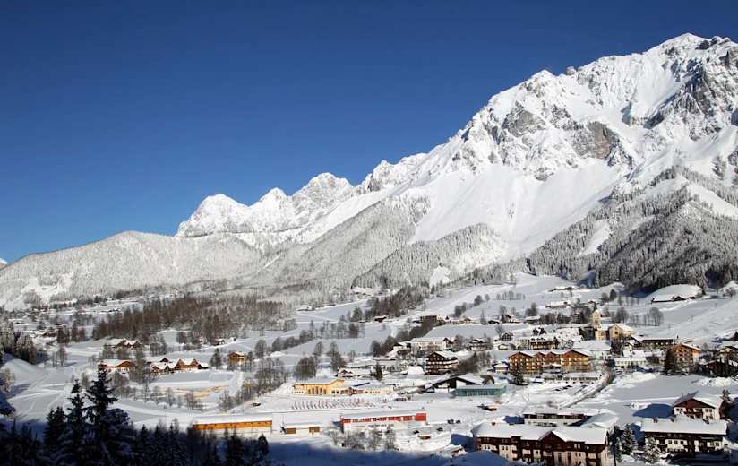 Winterwandern auf der Kulmbergrunde: Aussicht auf Ramsau am Dachstein und das Langlauf WM-Stadion. Foto: Tourismusverband Schladming-Dachstein – Tourismusverband Ramsau am Dachstein Bildergalerie (2)